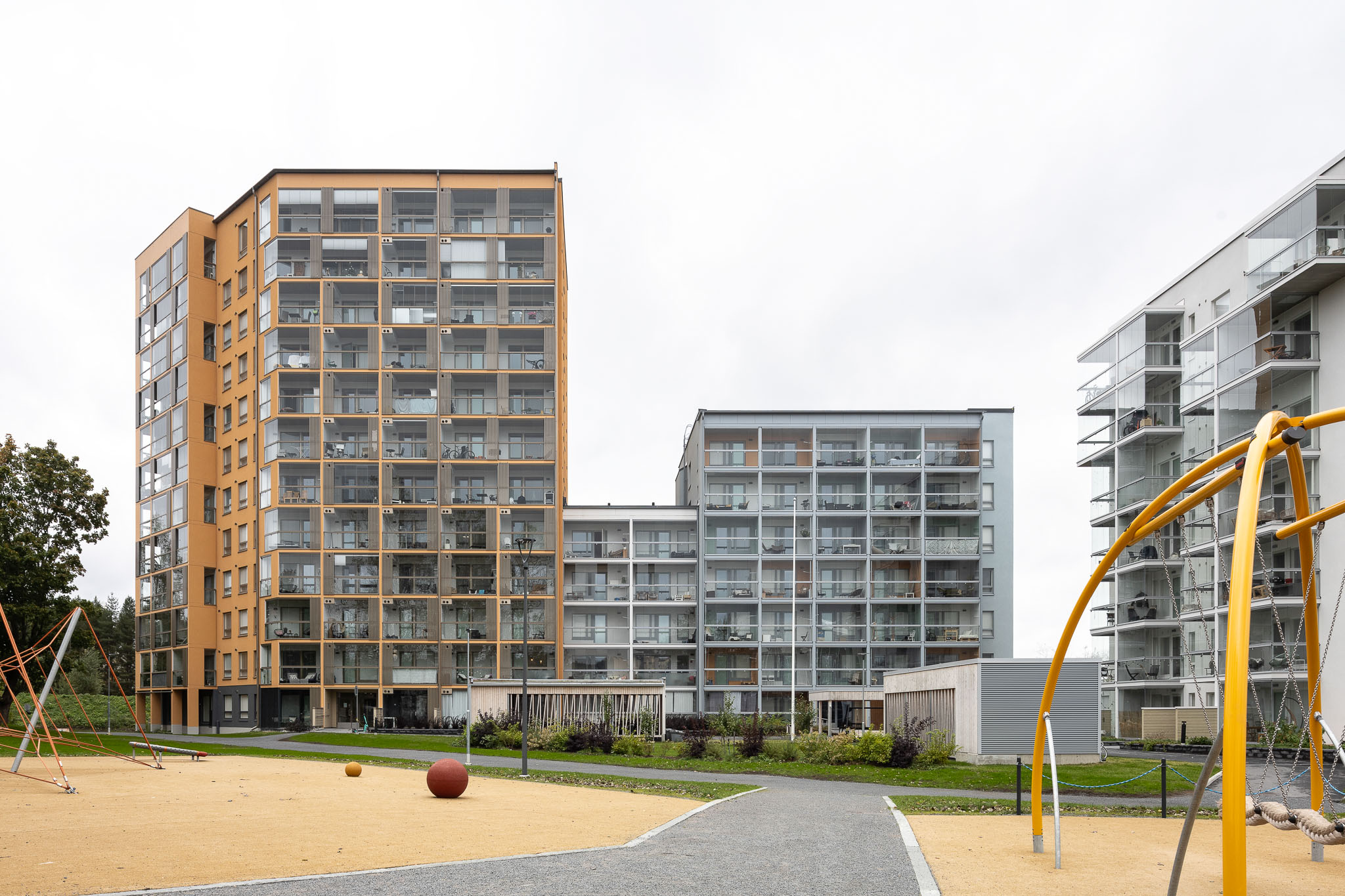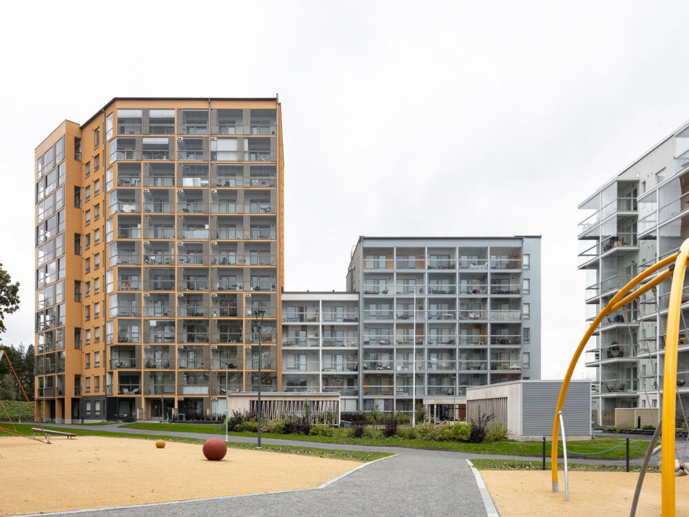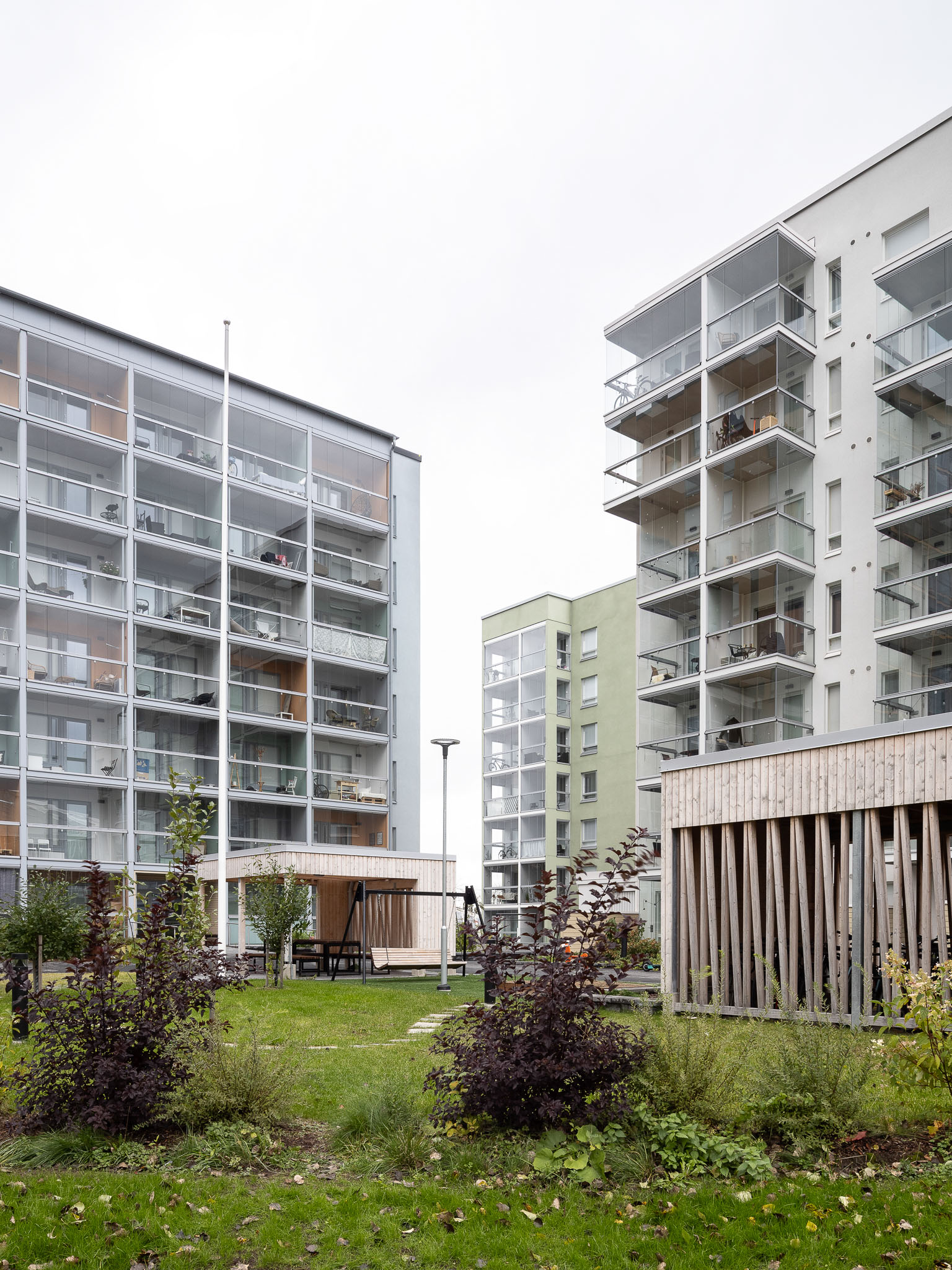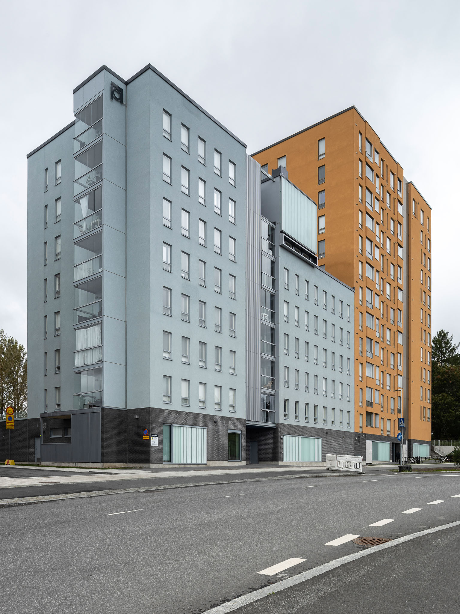 Opiskelijatalo. Rakennus muodostaa Jäähallinkaaren puolelle liikennemelulta suojaavaa muuria, ja avautuu voimakkaasti pihan ja puiston puolelle. Sisäkautta on yhteys pihakannen alapuoliseen parkkihalliin.