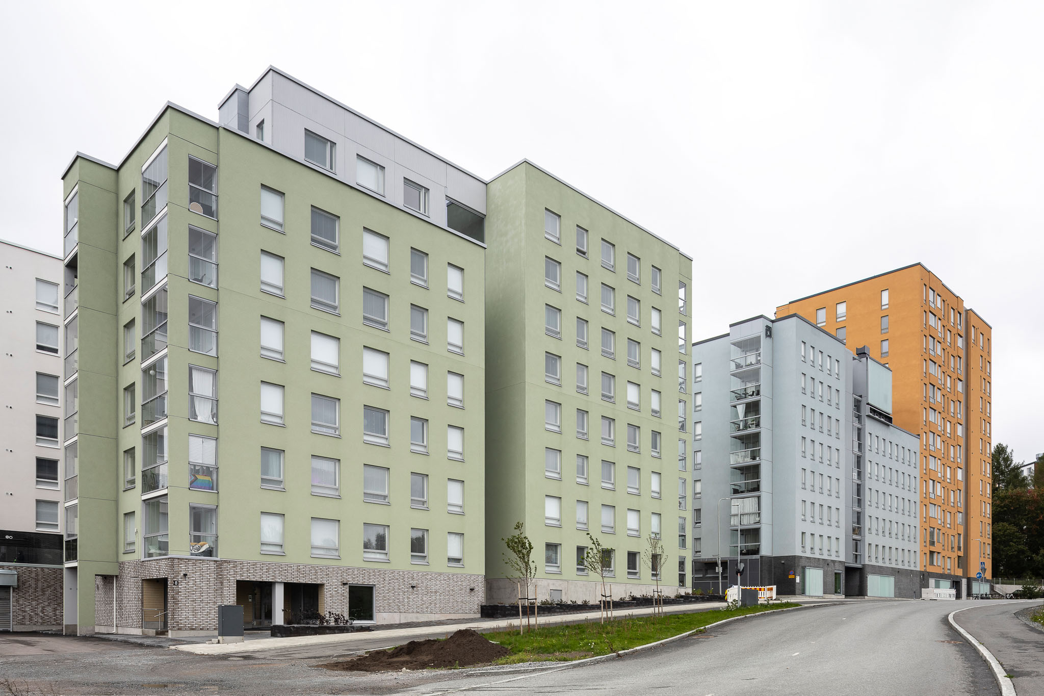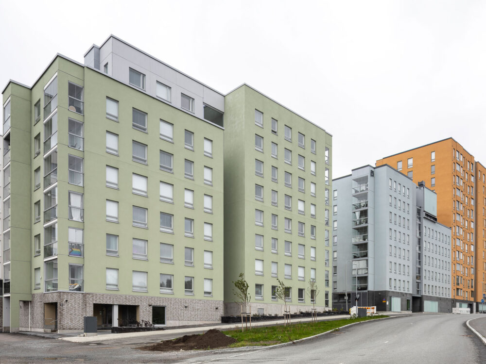 Liikennemelua blokkaa tehokkaasti talorivistö, jossa on suurta korkeus- ja värivaihtelua. Vaikka katujulkisivut ovat saman arkkitehtitoimiston käsialaa, tuotettiin niihin tarkoituksellisesti suurta keskinäistä vaihtelua, joka korostaa kunkin talon itsenäistä luonnetta. Keinoina käytettiin rehevää värin käyttöä ja ikkunoiden sijoittelun variointia.